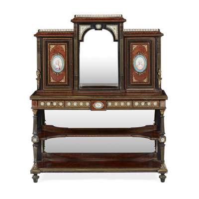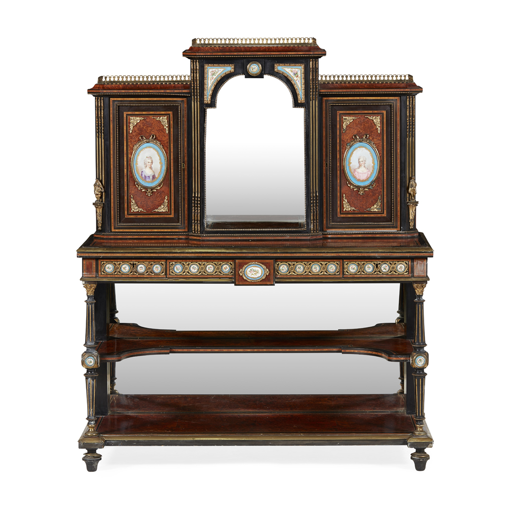 the breakfront top with a brass galleried central section with an open mirrored recess, flanked by doors with three quarter brass galleries over panels centred by Sevres style porcelain plaques depicting French beauties against a blue celeste ground, the corners mounted with gilt metal figures of Shakespeare and Milton; the lower section with a moulded brass edge over three frieze drawers mounted with rinceau and further porcelain plaques, above two tiers and mirrored back flanked by fluted tapered supports, raised on toupie feet