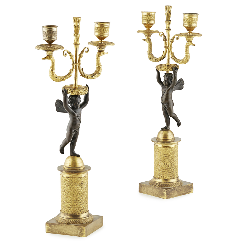 PAIR OF FRENCH EMPIRE GILT AND PATINATED BRONZE CANDELABRA