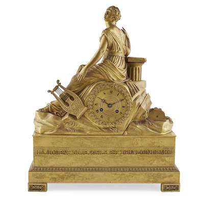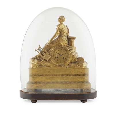 surmounted by a seated lady in classical dress leaning on a column capital with a lyre at her feet, above the gilt dial with Roman numerals, signed L. S. MALLET HR. DE MGR. LE DUC D'ORLÈANS, above the inscription LE MOMENT OU JE PARLE EST DEJA LOIN DE MOI, with an acanthus cast border and rectangular set feet, striking a bell, in a matched glass dome