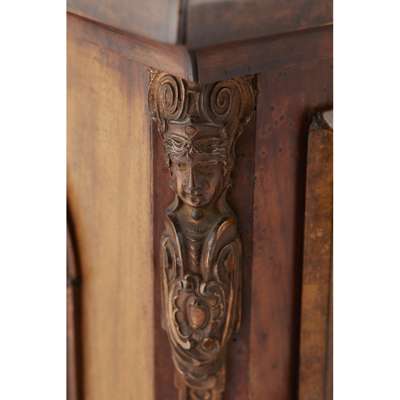 the domed top surmounted by an urn and four flame finials, above a gilded plate with silvered chapter ring with Roman numerals and two subsidiary dials, raised on a stepped moulded base and gilt brass paw feet, the three-train movement marked RSM and striking gongs