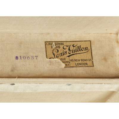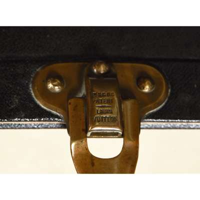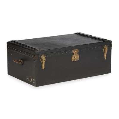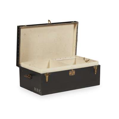 covered in black leather with black leather straps and stamped brass hardware, the linen lined interior with a divided lift-out tray and paper label with serial number 8100137; personalised initials H.D.C to the sides