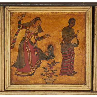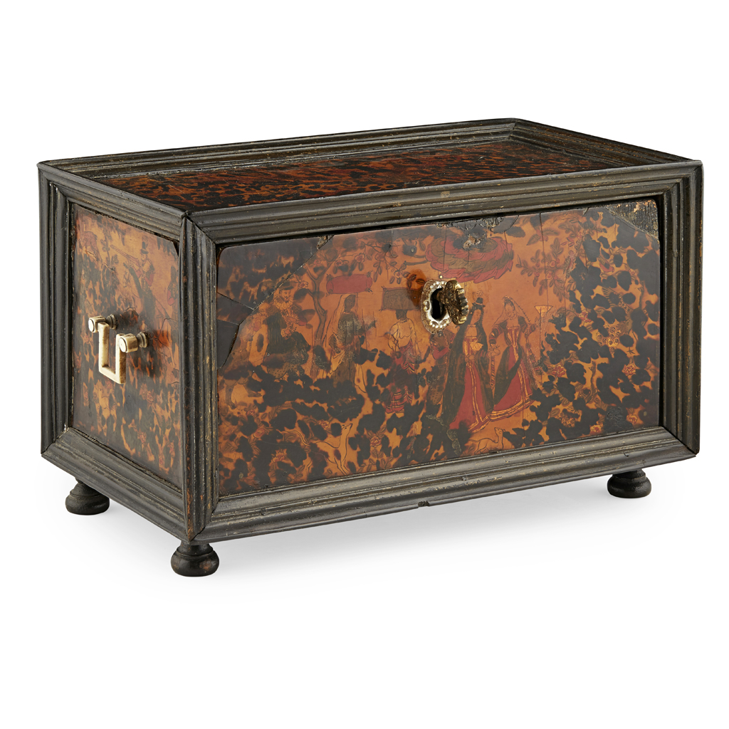 of rectangular form outlined with ebony moulding enclosing tortoiseshell panels backed with painted gold leaf scenes of European figures, animals and birds; the drop-front with a mother-of-pearl escutcheon opening to three short drawers above one long drawer outlined with ivory banding with further scenes of Europeans and Indian servants, raised on turned bun feet