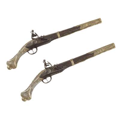 with walnut full stocks with applied gilt metal mounts, carved wood foliate scroll decoration and large pommels with wire bindings, with dummy ram rods, the flat engraved banana shaped locks with iron trigger guards with acanthus leaf finials, with pierced side plates (2)
