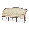 the upholstered arched back and enclosed arms over a cushioned seat, raised on eight cabriole legs, the front legs with scrolled toes, covered in cream damask upholstery