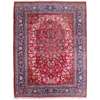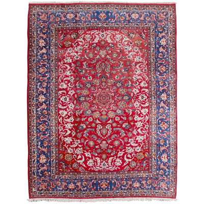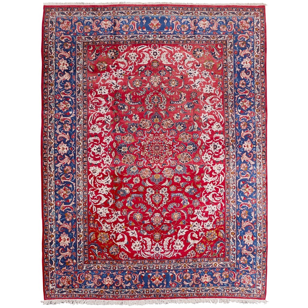 the red field with small cream lattice medallion, cream foliate oval surround, within indigo palmette and vine border