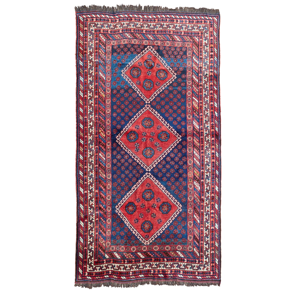 the indigo field with three red lozenge medallions, within multiple borders