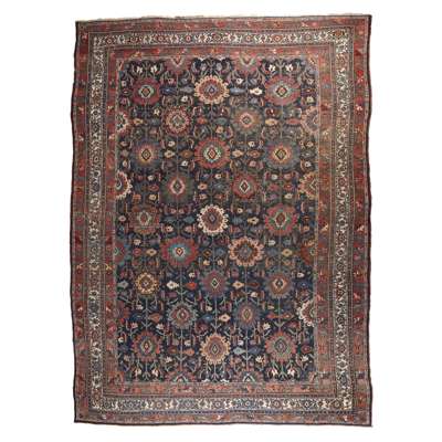 the indigo field with allover stylised palmette and vine pattern, within ivory turtle palmette and vine border