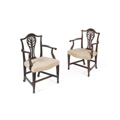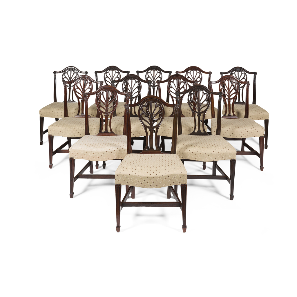 the bead moulded top rails marked at the corners with carved sunflower roundels and trailing husks, above carved and pierced anthemion splats, over wide stuffover serpentine seats covered in pale cream trellis pattern upholstery, raised on fluted square tapered legs ending in spade feet and joined by stretchers, comprising twelve side chairs and a pair of armchairs (14)