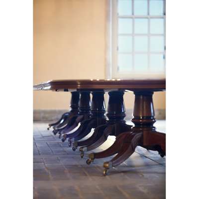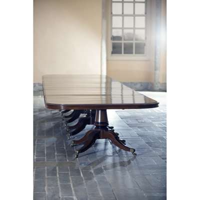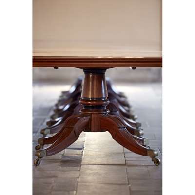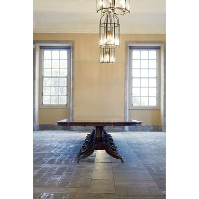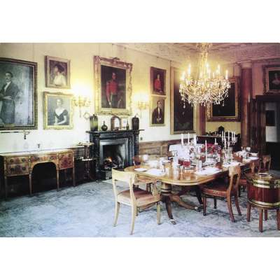 Note: With spectacular views spanning the shores of Loch Lomond, Rossdhu House is a three-storey classical country house commissioined by the 26th Laird, Sir James Colquhoun in 1772 and further expanded by his son, the 27th Laird, also James Colquhoun. The Palladian style building, now grade A listed, was designed by an unknown architect, although there are some house records to indicate it may have been a Mr. Thomas Brown, while Sir John Clerk of Penicuik is known to have been consulted. Built from a combination of honey and pink coloured sandstone ashlar, the house is characteristic of Scottish architecture from the eighteenth and early nineteenth centuries and the interest in the Classical orders. It features many elements which draw upon the symmetry and proportion of the architecture of ancient Greece and Rome, including an elevated entrance featuring a striking portico framed with a series of Tuscan columns. The original central core of the house is flanked by two wings added in the 1810s, which included an enlarged dining room where the present dining table was located. The house remained the residence of the Colquhoun family until the 1980s when it was leased and developed, becoming the home of the exclusive Loch Lomond Golf Club.