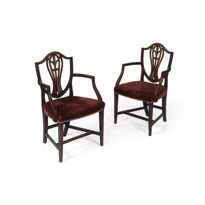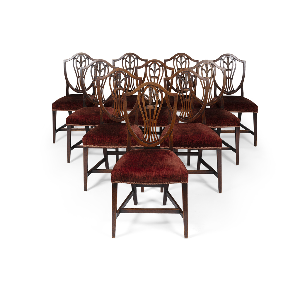 the shield-shaped backs with pierced baluster splats carved with Prince of Wales plumes, over stuffover seats covered in red plush and raised on square tapered legs joined by stretchers, comprising ten side chairs and a pair of armchairs (12)