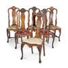 comprising a set of four with shell carved crest rails above baluster splats, and a pair of similar chairs with stretcher rails, all with flowering urn and floral marquetry, over serpentine drop-in seats raised on cabriole legs with carved claw and ball feet (6)