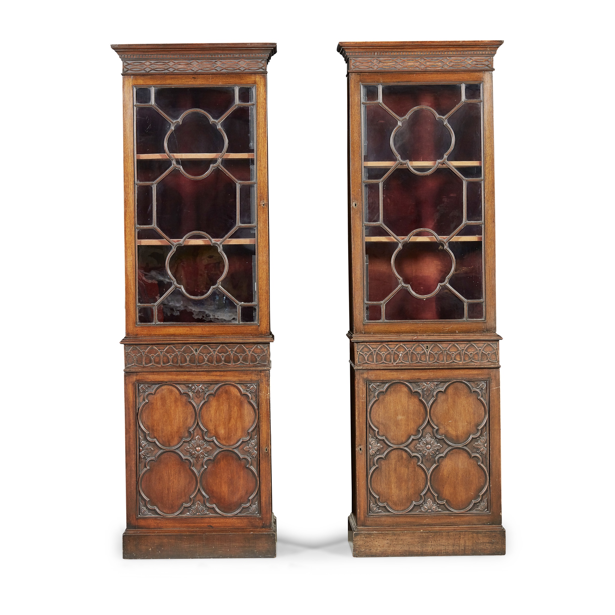 the dentil moulded cornices above blind fret carved friezes, over astragal glazed doors opening to adjustable shelves, the lower parts with blind fret carved frieze drawers over foliate carved and quatrefoil moulded panel doors on plinth bases (2)