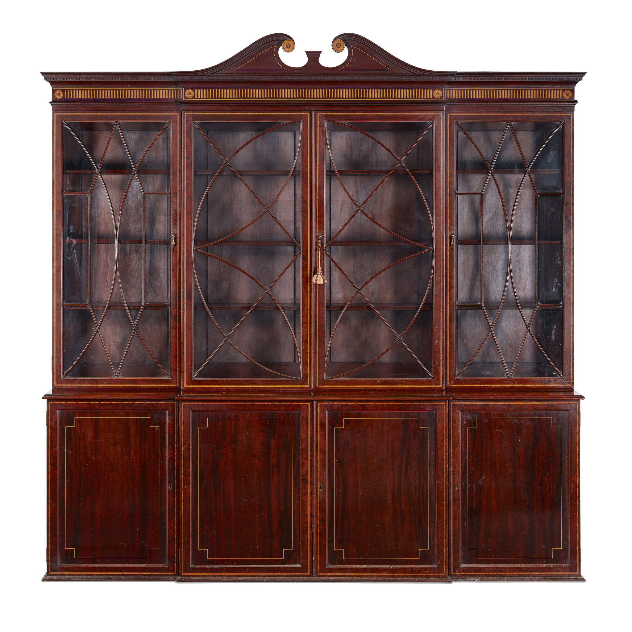 GEORGIAN STYLE MAHOGANY AND SATINWOOD BREAKFRONT BOOKCASE
