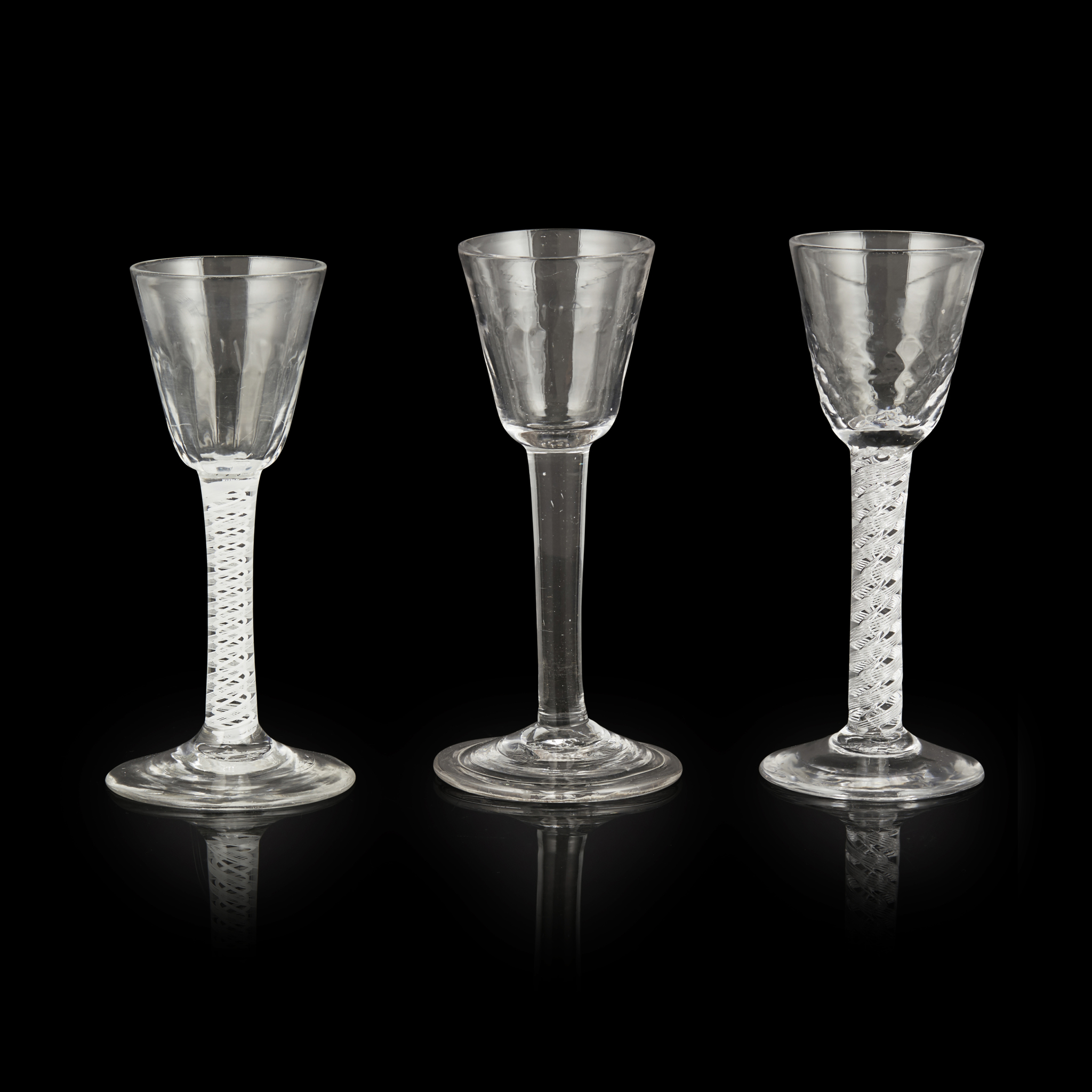 all with hammered round funnel bowls, comprising one on a double series air twist stem, 15cm high; an example with a double series opaque twist stem, 14.5cm high; and a glass with a plain stem and folded foot, 15cm high (3)