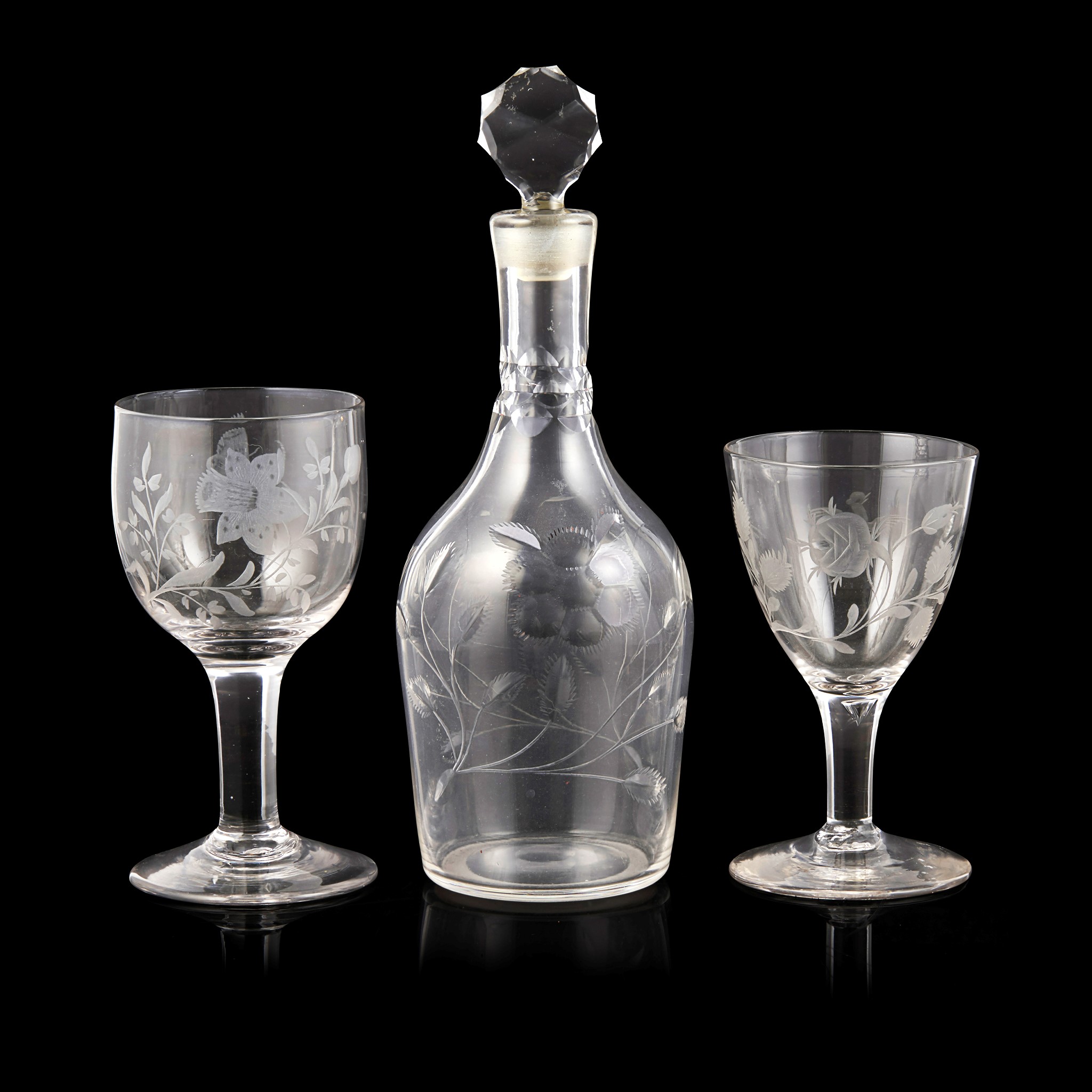 comprising a shouldered decanter and facet-cut stopper, decorated with roses and buds, 29.5cm high; a rummer engraved with a daffodil and moth, 17cm high; and a rummer with rose heads and buds with a small bird, 15.5cm high (3)