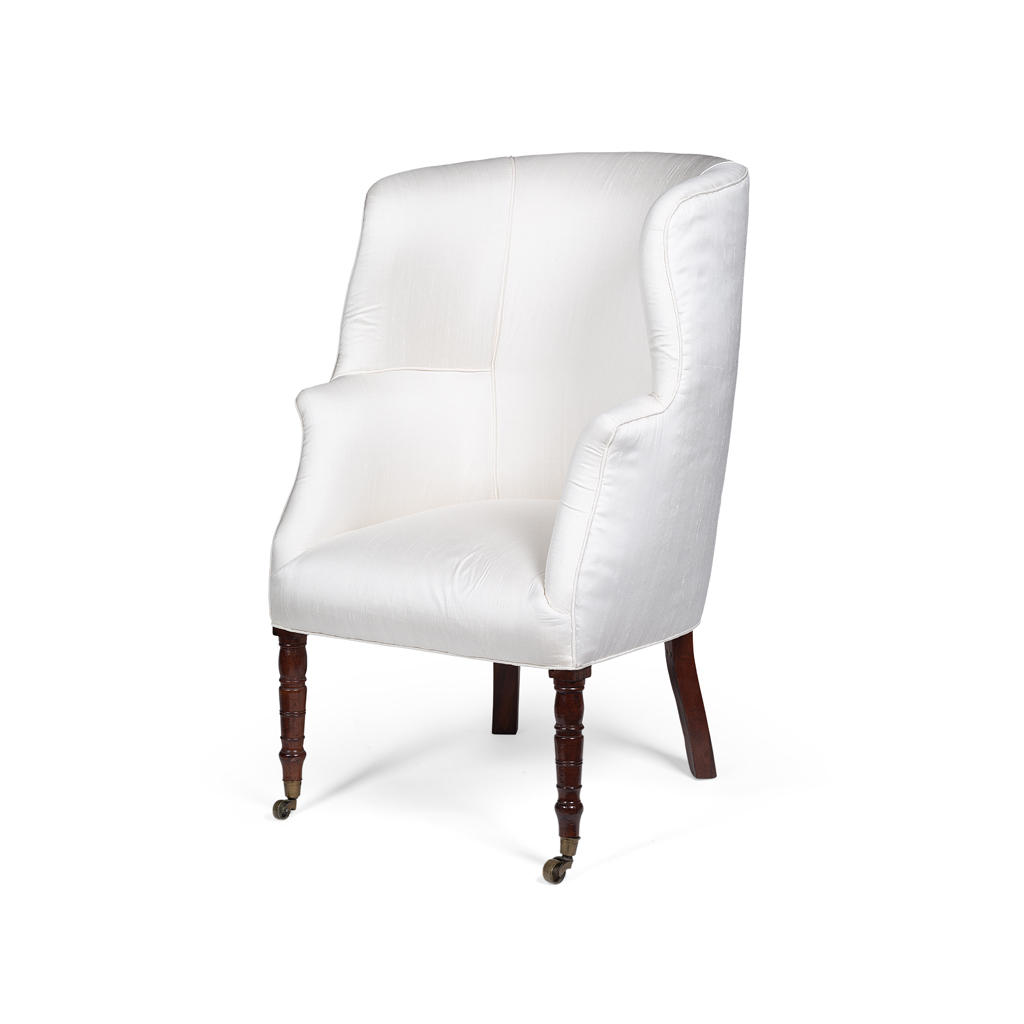 LATE GEORGE III MAHOGANY FRAMED WINGBACK ARMCHAIR