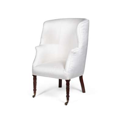 in the Sheraton style, the curved back and shaped wings above outscrolled arms and a padded seat, raised on turned and tapered legs ending in castors, covered in white silk