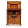 the superstructure with open shelves flanked by cupboards, above a secretaire drawer opening to a leather tooled writing surface and an arrangement of drawers and pigeon holes, over a pair of twin panelled doors flanked by outset column supports raised on tapering legs