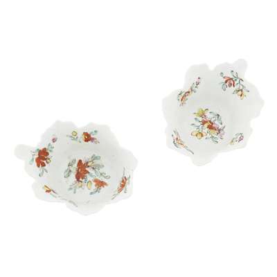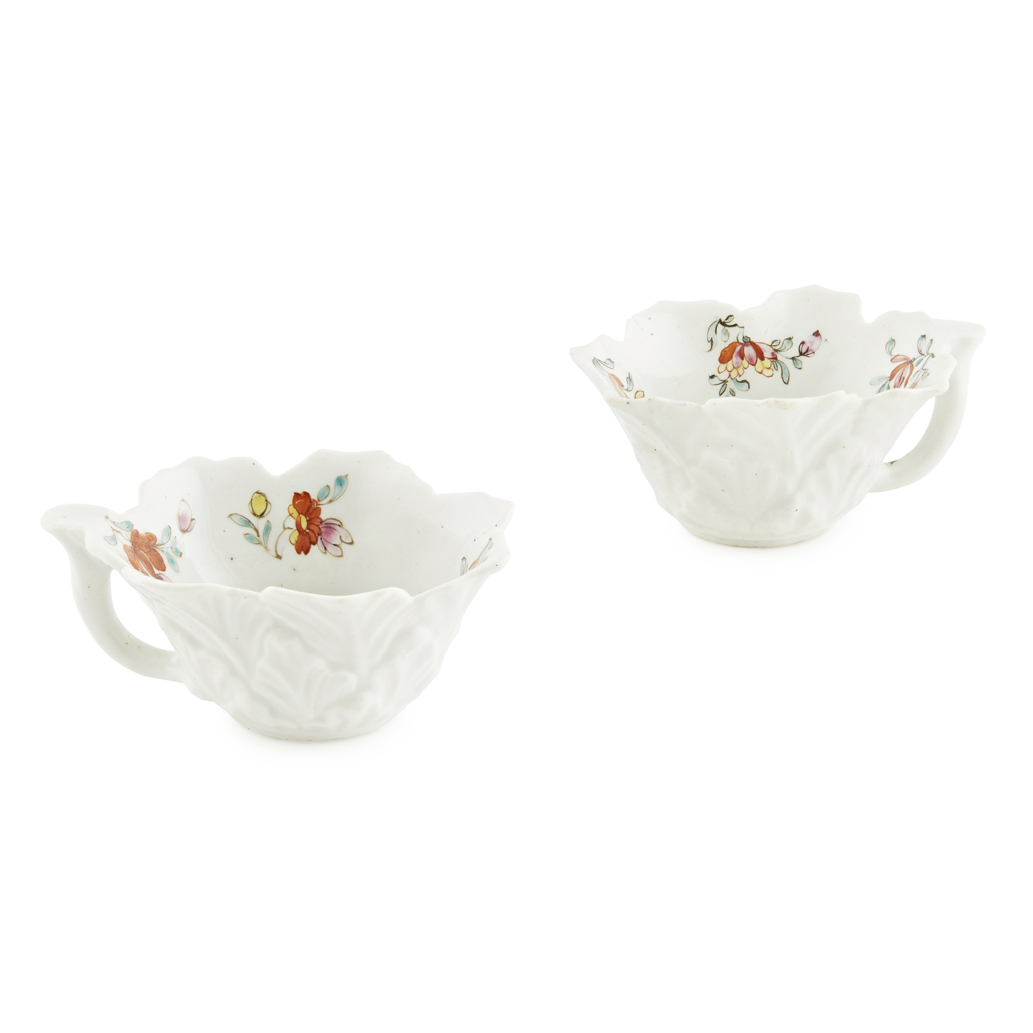 the exteriors moulded with overlapping geranium leaves and issuing twig handles, painted to the interiors with flower sprigs in polychrome enamels, unmarked (2)