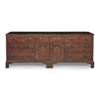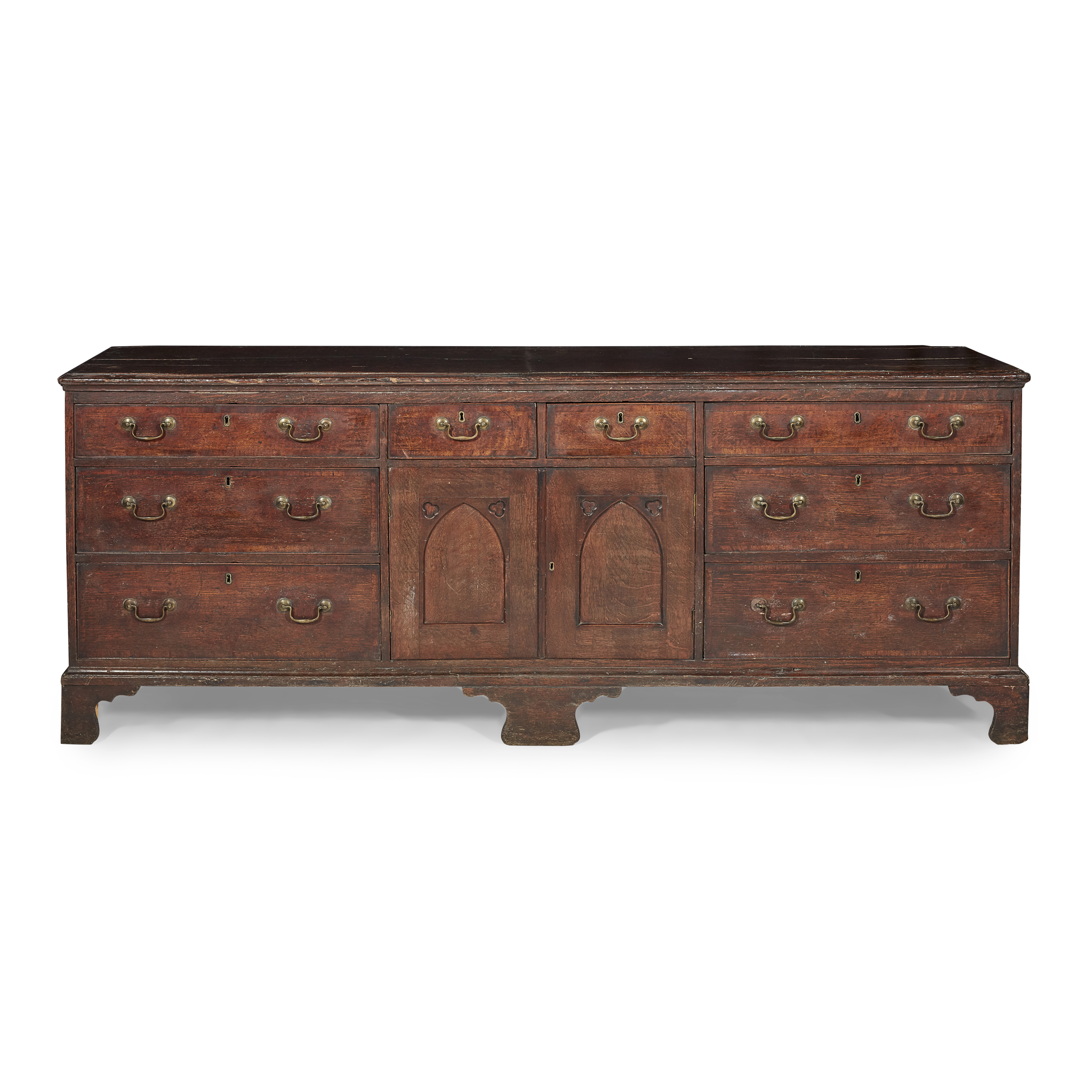 the top with a moulded edge above a central pair of short drawers over a pair of pointed arch panel doors, flanked by banks of three long drawers with walnut banding, raised on bracket feet