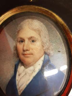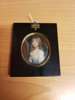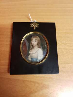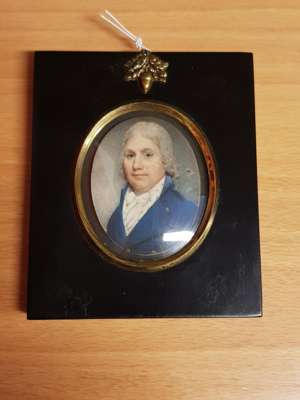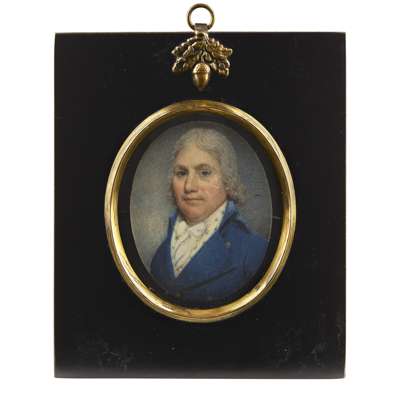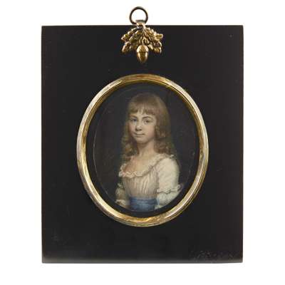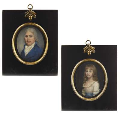 oval, watercolour on ivory, the first of girl in an Empire waist dress with blue sash, the second a gentleman in a blue coat, in glazed ebonised frames (2)