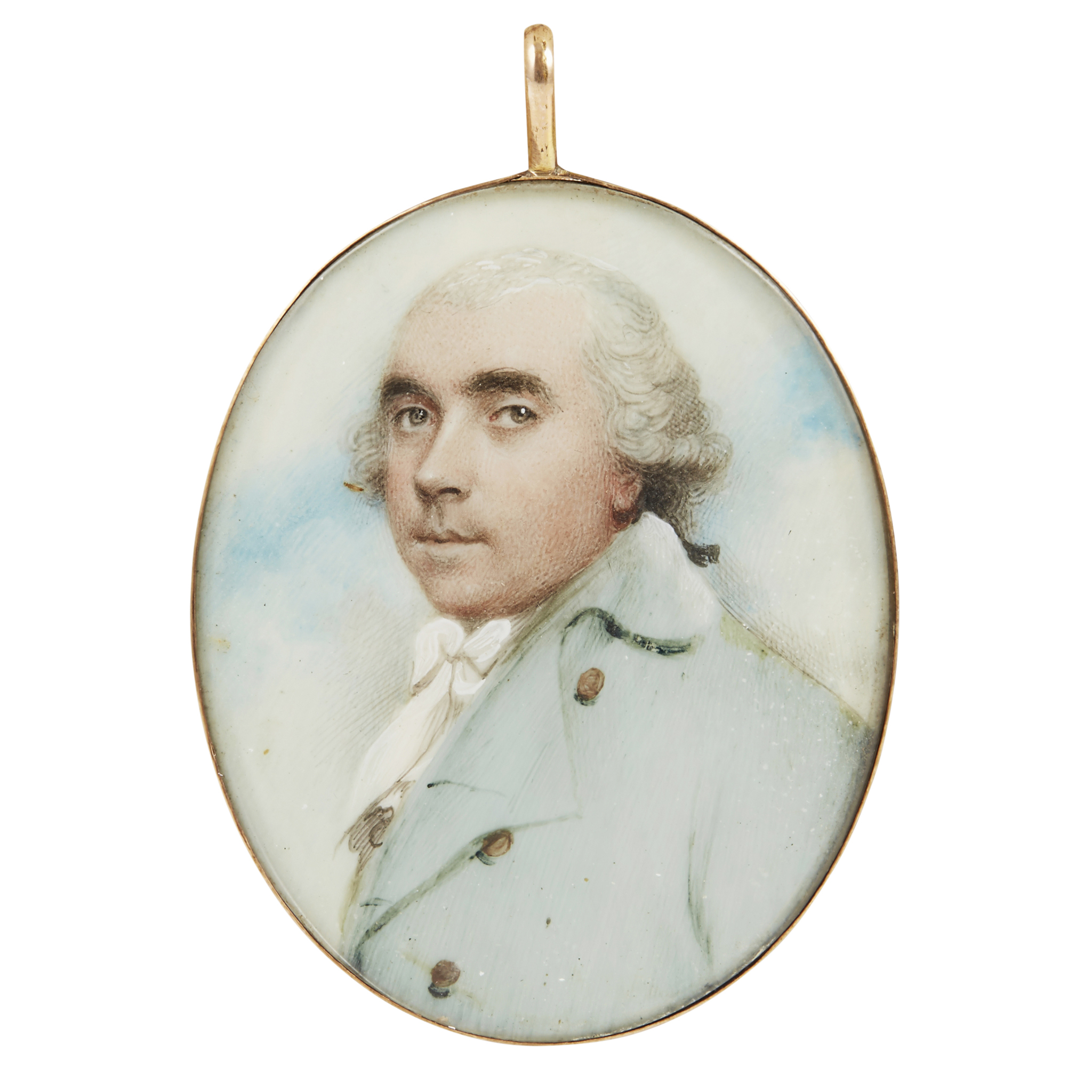 watercolour on ivory, oval, the sitter with powdered hair and wearing a pale blue coat and white cravat, against a cloud filled background, in a gilt metal frame