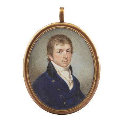 watercolour on ivory, oval, the sitter in a blue jacket and white cravat, with plaited hair verso, in a gilt metal frame