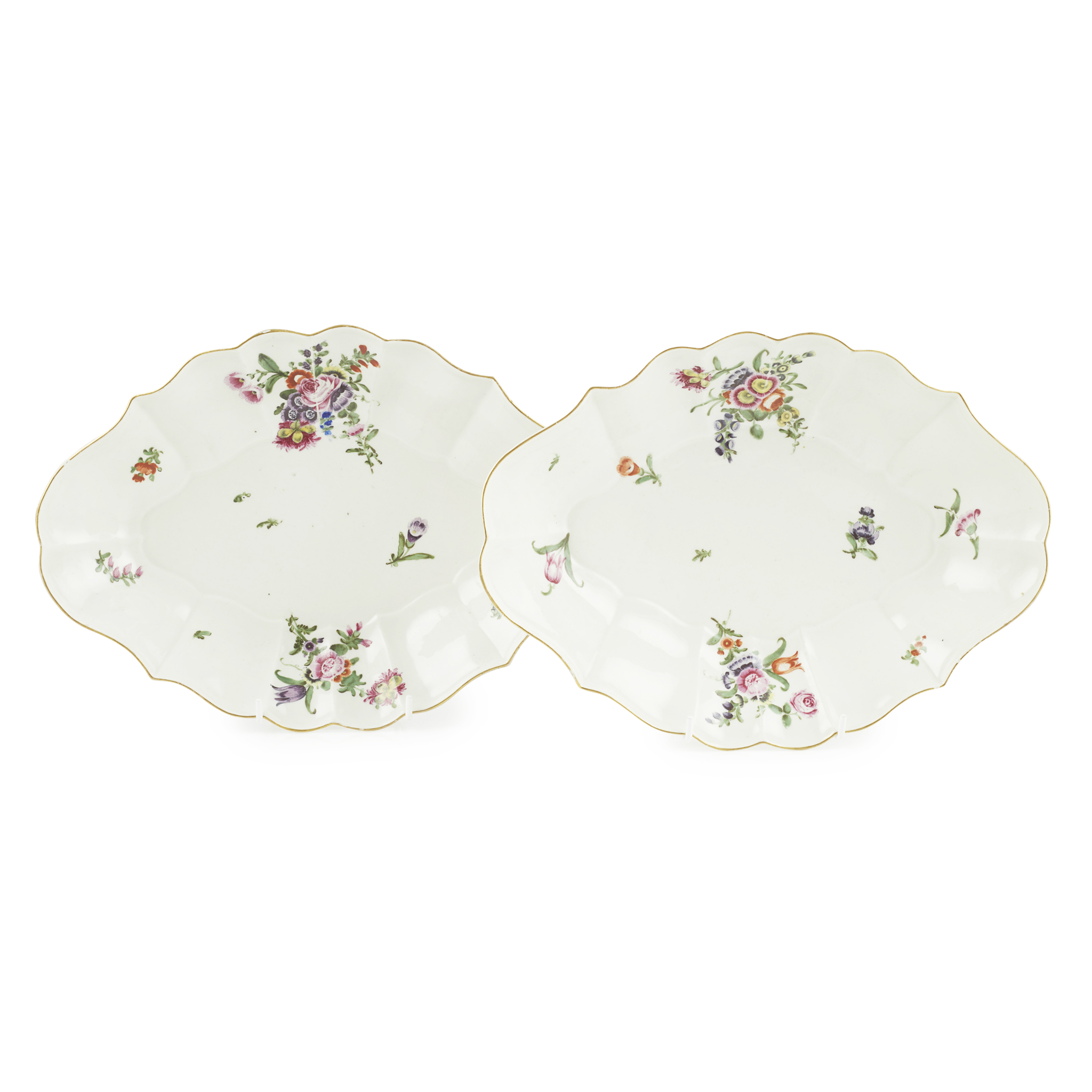 of shaped oblong form with moulded cavettos and gilt rims, decorated with flower sprigs and sprays (2)