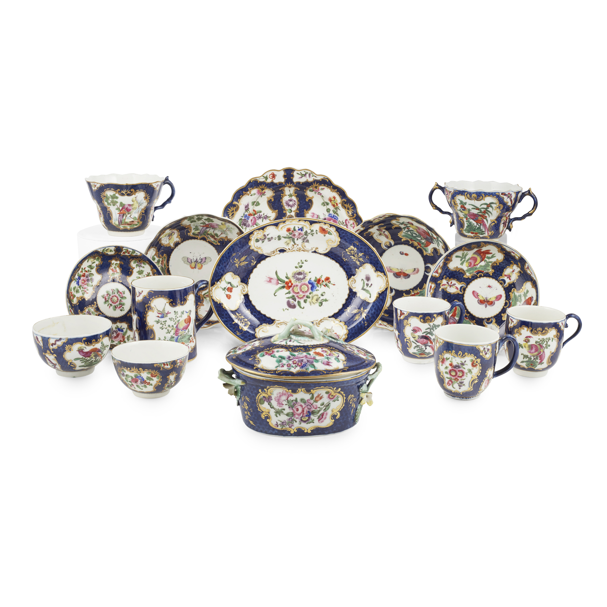 variously decorated with polychrome reserves of birds, insects and flowers, on scale blue grounds with gilt borders, square seal marks, comprising a lobed plate, 19cm diam.; a small covered tureen and underplate, with label for T. A. HALL, BURNLEY., underplate 20cm wide; a mug, with the same label, 8.5cm high; a twin-handled cup and a single-handled cup, 7cm high; two deep saucers, 14.5cm diam.; three coffee cups, 6.5-6cm high; a teacup, 5cm high; a tea bowl, 7.5cm diam.; and two saucers, 13cm and 12cm diam. (15)