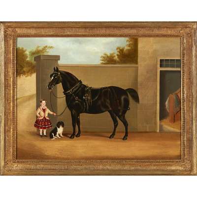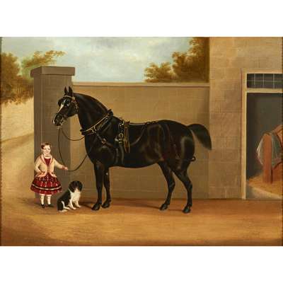 YOUNG GIRL WITH DOG AND BLACK HORSE