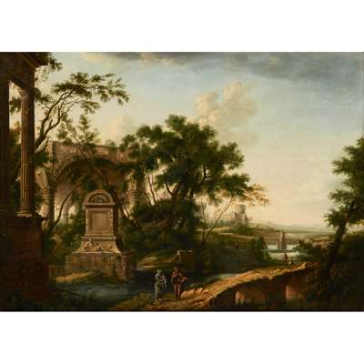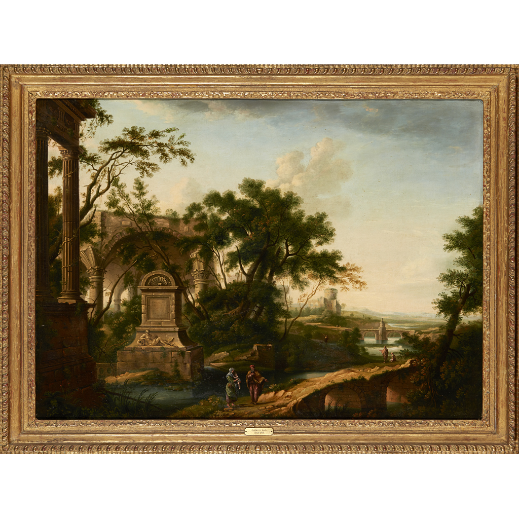 A CLASSICAL LANDSCAPE WITH FIGURES BY RUINS