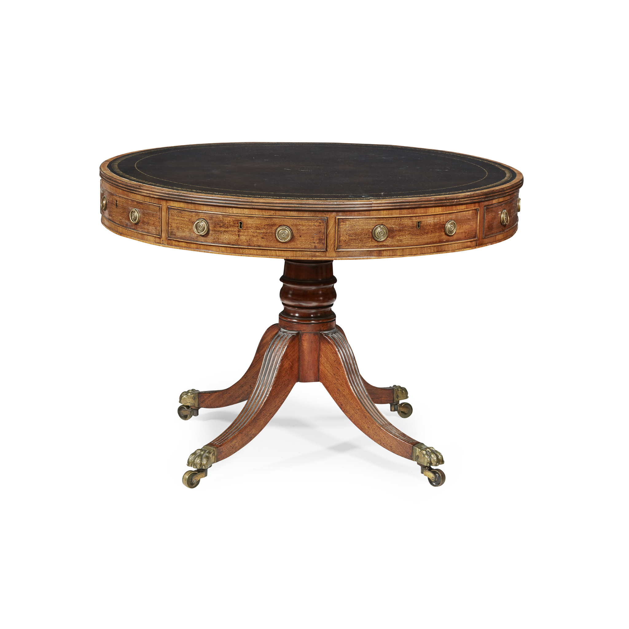 the circular top with a black and gilt tooled leather insert above four real drawers, a fitted pen and ink drawer, and three further dummy drawers, on a turned pedestal support on reeded outswept legs ending in brass hairy paw caps and castors