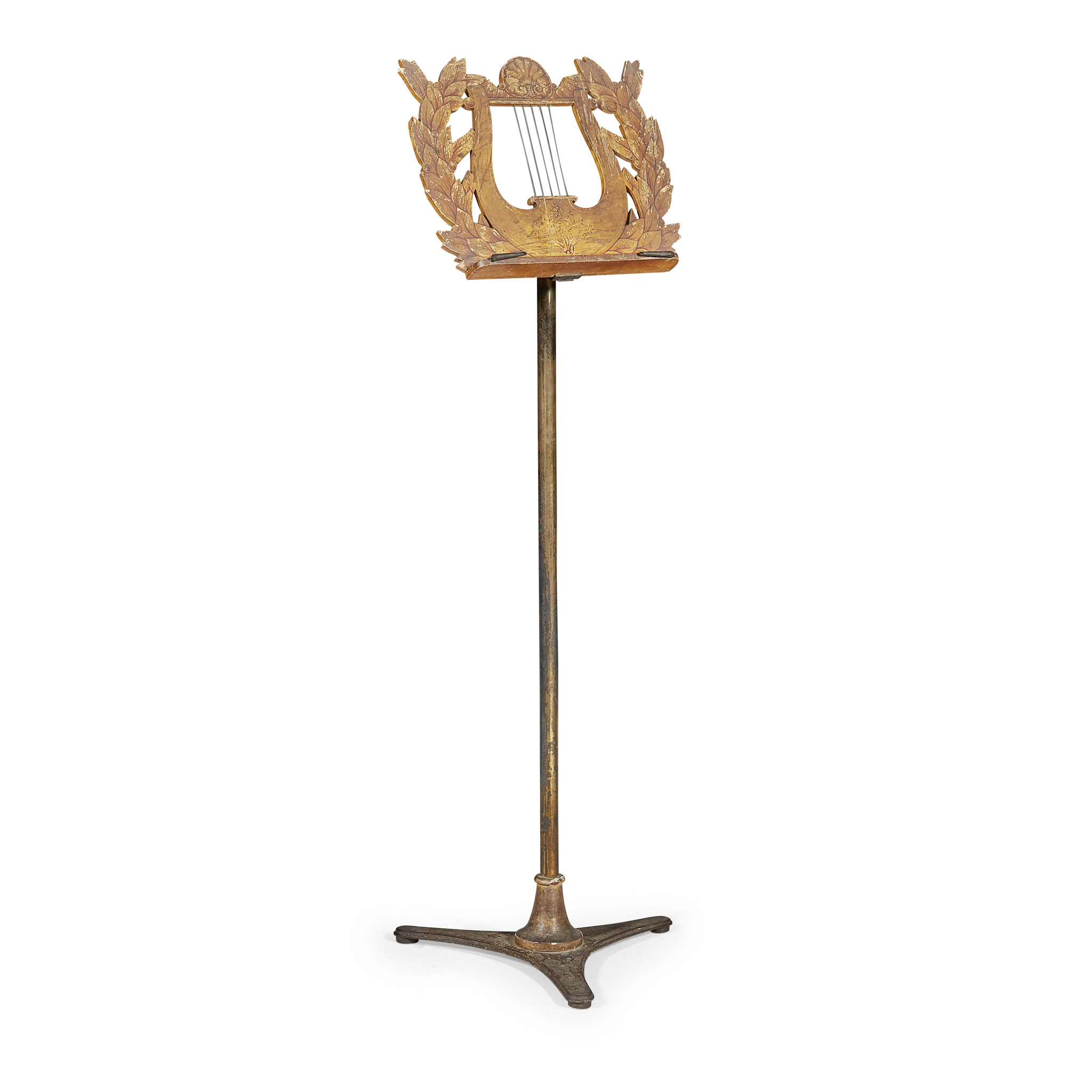 the lyre shaped music support painted with laurel and a shell motif, on an adjustable cast iron and brass support with a triform base