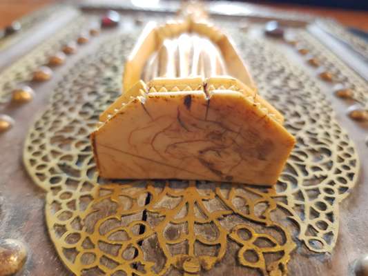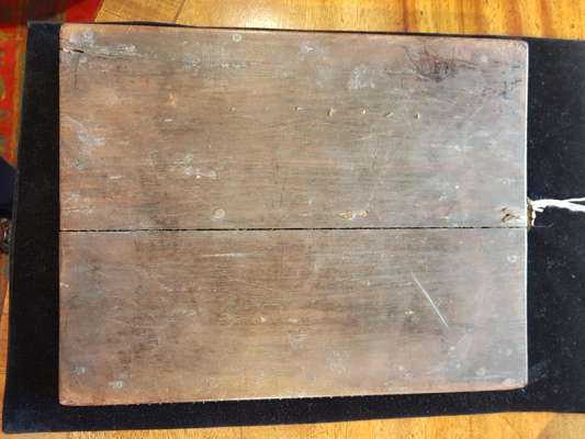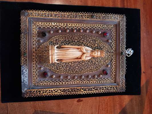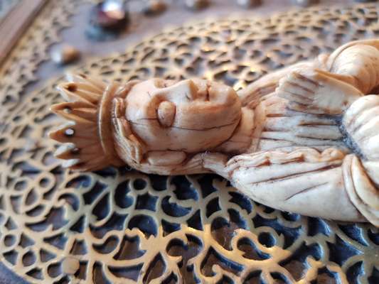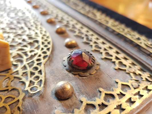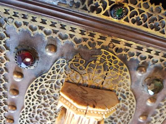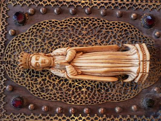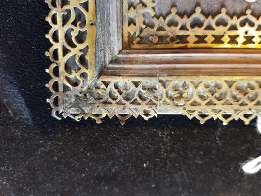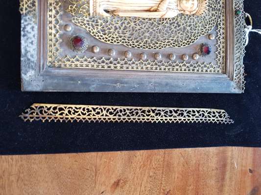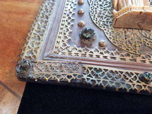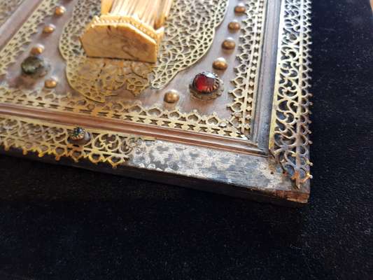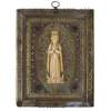 the standing figure wearing a crown with hands raised in prayer, mounted on a pierced brass ground against a wooden panel set with red and green glass cabochons, copper studs, and brass filigree borders