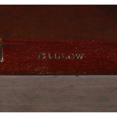 the sliding upper section with a gallery and sloping leather writing surface, enclosing two drawers and a dummy drawer, the left side with document slide and three dummy drawers, the right side with stationery drawer, further slide and drawers below, the top drawer stamped GILLOW, raised on lobed bun feet