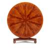 the circular tilt top with radial veneers and crossbanding, on a facetted column with acanthus carved base, on a triform platform raised on gilt foliate carved ball feet with bass castors