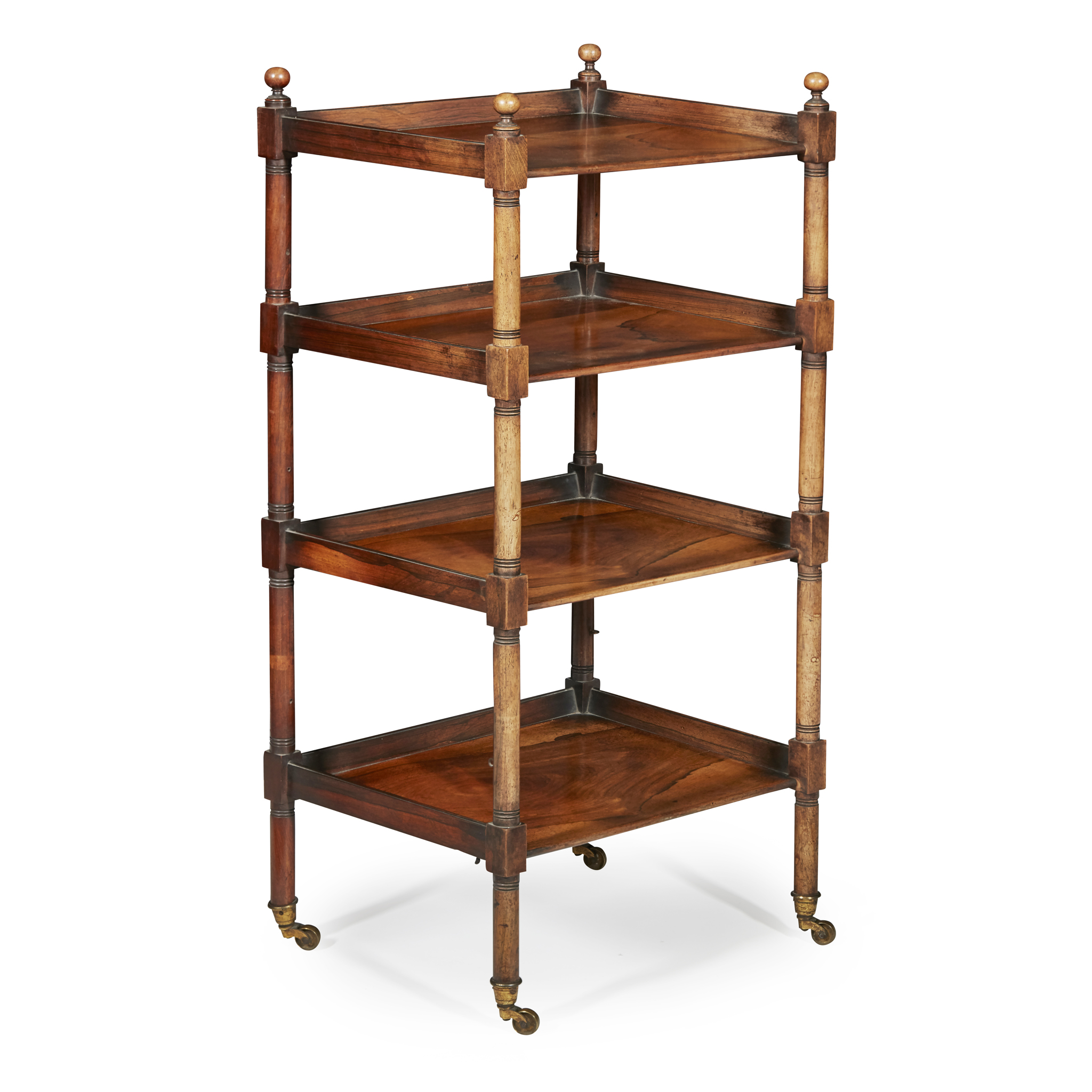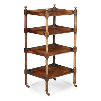 with four tiers with three quarter galleries, raised and divided by ring turned supports with ball finials and ending in brass caps and castors