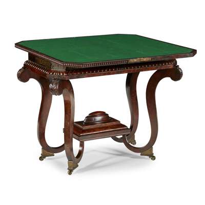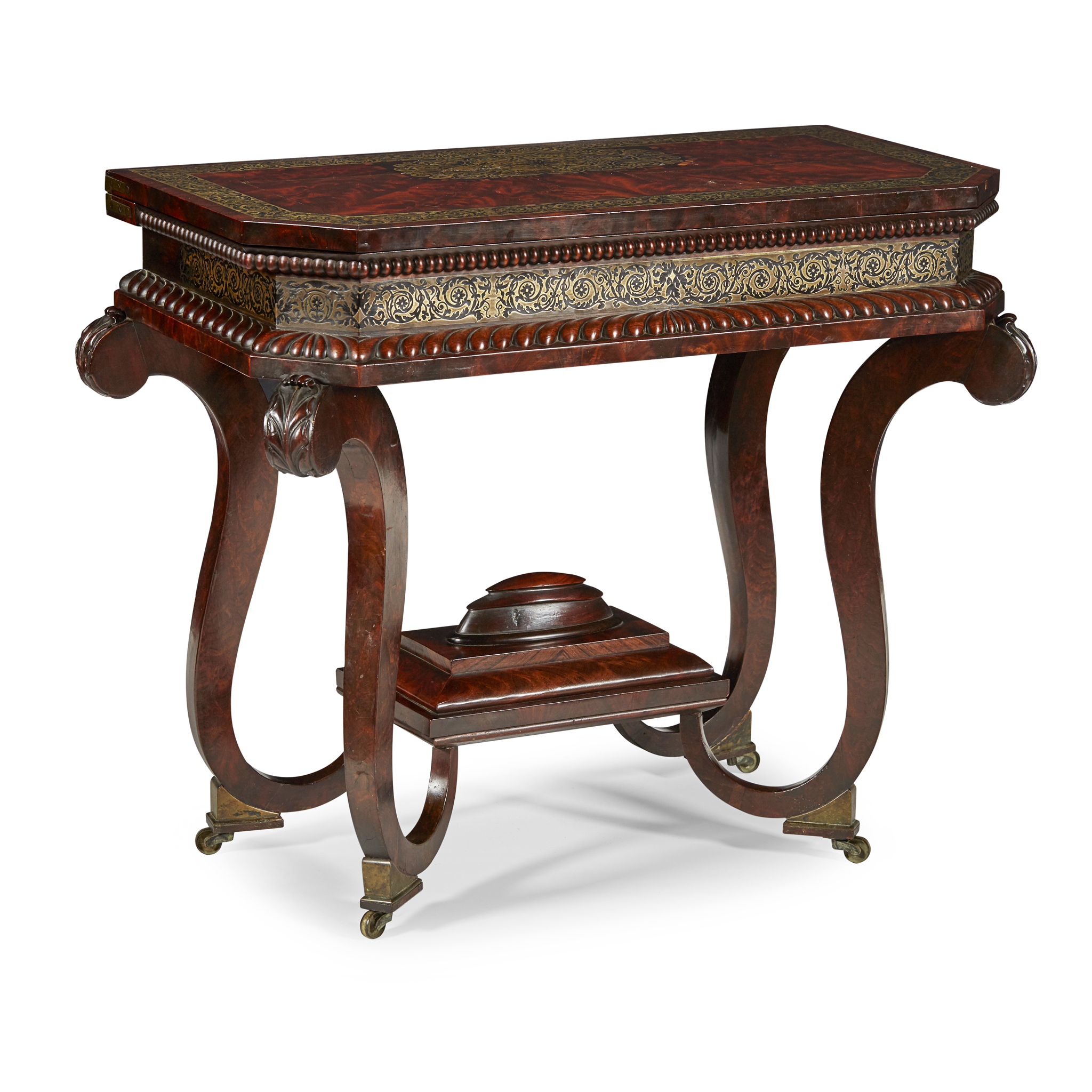 IRISH GEORGE IV MAHOGANY, COROMANDEL AND BRASS INLAID GAMES TABLE