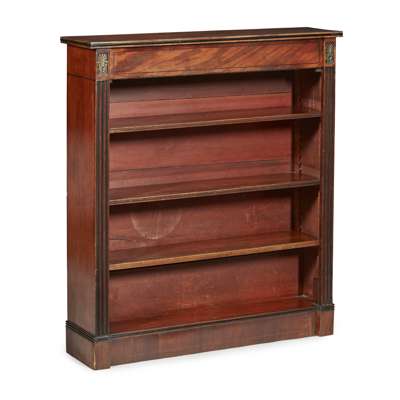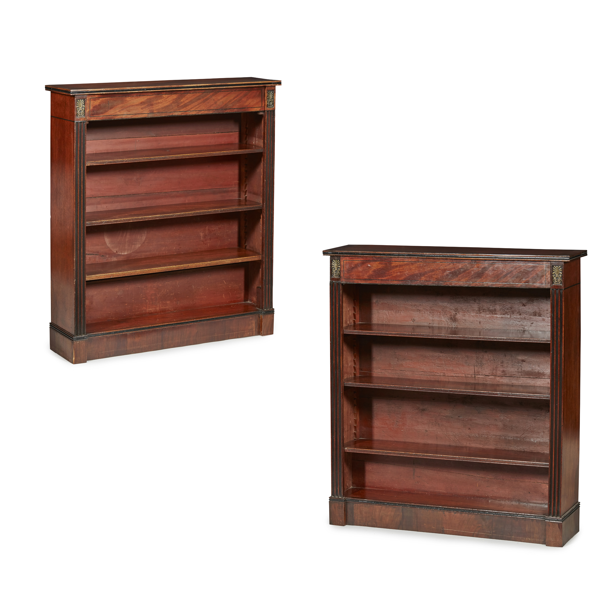 PAIR OF REGENCY MAHOGANY, EBONY, EBONISED, AND BRASS MOUNTED OPEN BOOKCASES