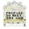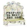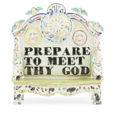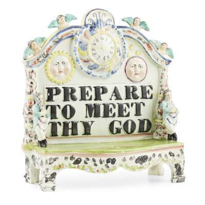 modelled with angels above a painted clock dial flanked by the sun and moon, and the inscription PREPARE TO MEET THY GOD, with figures of men, one holding a bible, the other a sword, on a serpentine base with sponged decoration