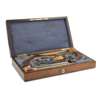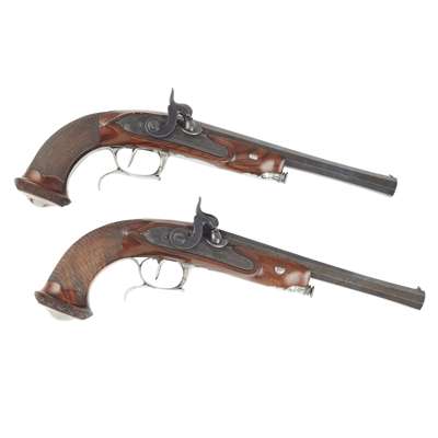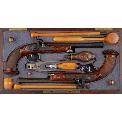 signed on the lock plates PAR. BREVET D'INVENTION/ BRUNEEL À LYON, with octagonal Damascus barrels and walnut stocks with chequered grips, terminating in carved butts, with shortened metal ramrods, in a relined case fitted with accessories, including a wooden mallet, bore rod, cleaning rod, cap holder, screwdriver, flask and ball mould