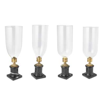 FOUR REGENCY STYLE MARBLE AND BRASS STORM LAMPS