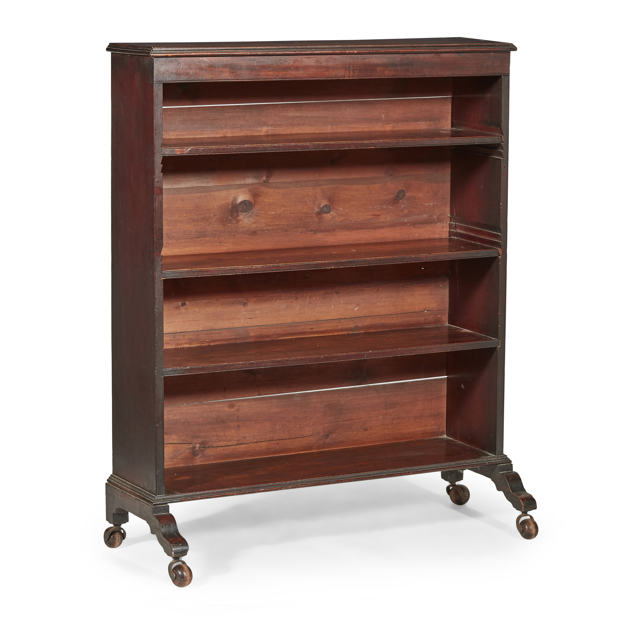 with three open shelves, on trestle feet and castors