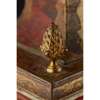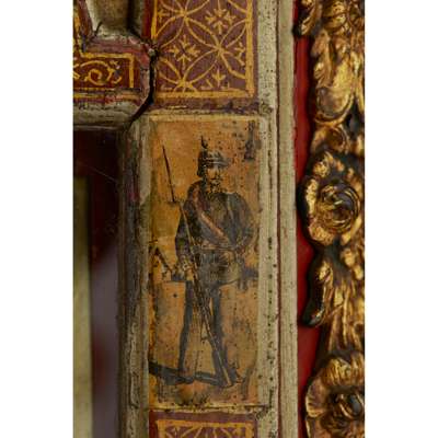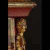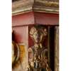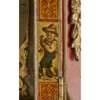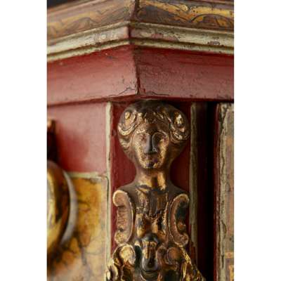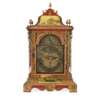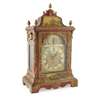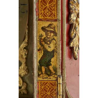 the bell top with gilt brass pine cone finials and découpage scraps, above an arched brass dial signed WILLM/ CREAK/ LONDON to the arch above the Roman numeral chapter, with a subsidiary STRIKE/SILENT dial, date and mock pendulum apertures, in a red lacquered and parcel-gilt case, fitted with mask corner mounts and twin brass handles, the engraved backplate enclosing the triple fusée eight-day movement with bell strike, and chiming on eight further bells, with a paper label to the interior CAMERER, CUSS & CO.