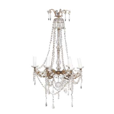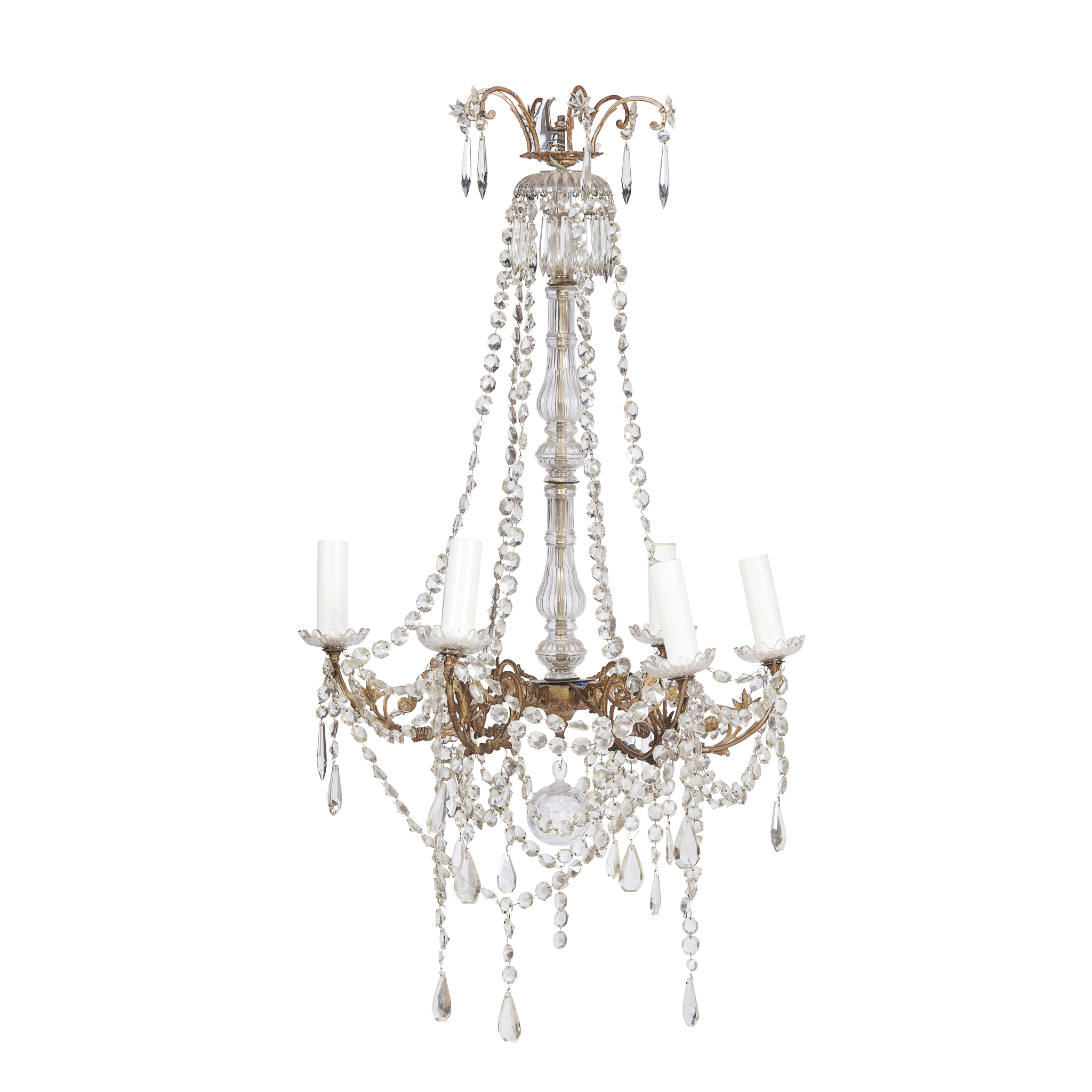 the corona with stars and pointed prisms above a central baluster stem issuing six gilt metal scrolling arms with drip pans and candle sleeves, the whole hung with prism drops and swags