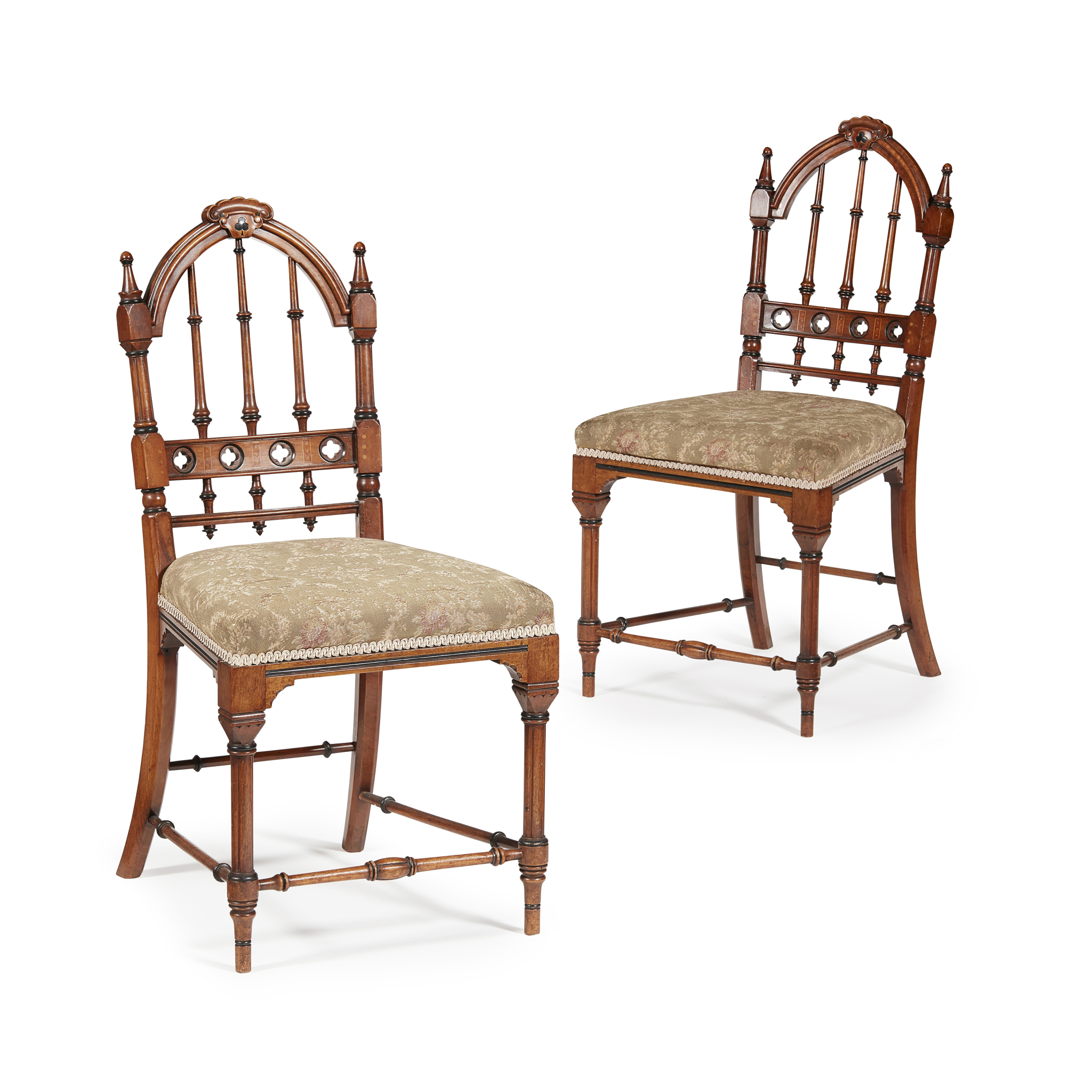 the arched spindle backs with crocket finials and quatrefoil cut-outs, above padded seats raised on ring-turned legs joined by peripheral stretchers (2)