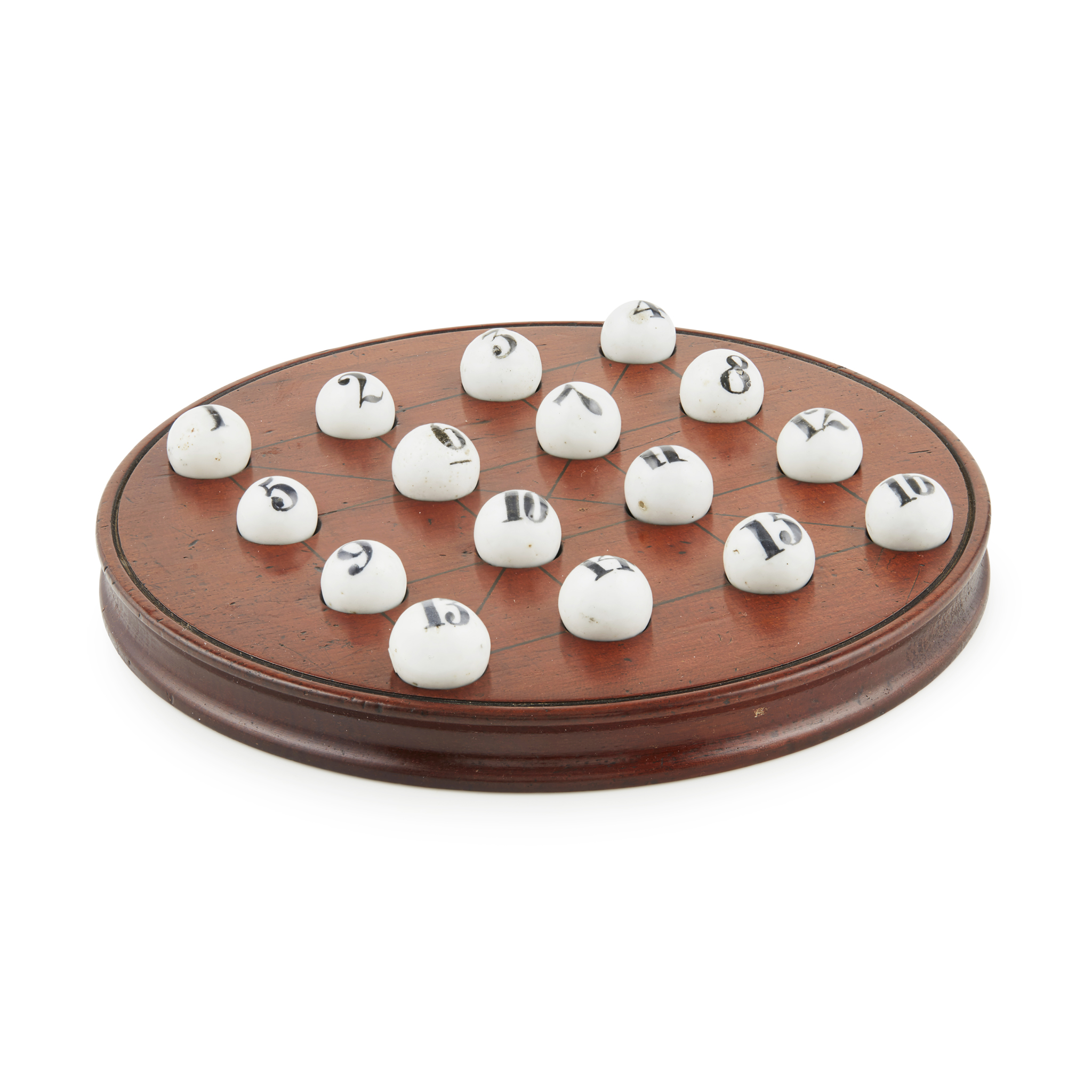 the mahogany board with sixteen recesses and corresponding numbered white glazed pottery marbles, with Victorian design lozenge mark for 25th November, 1858, impressed maker's marks JAQUES LONDON