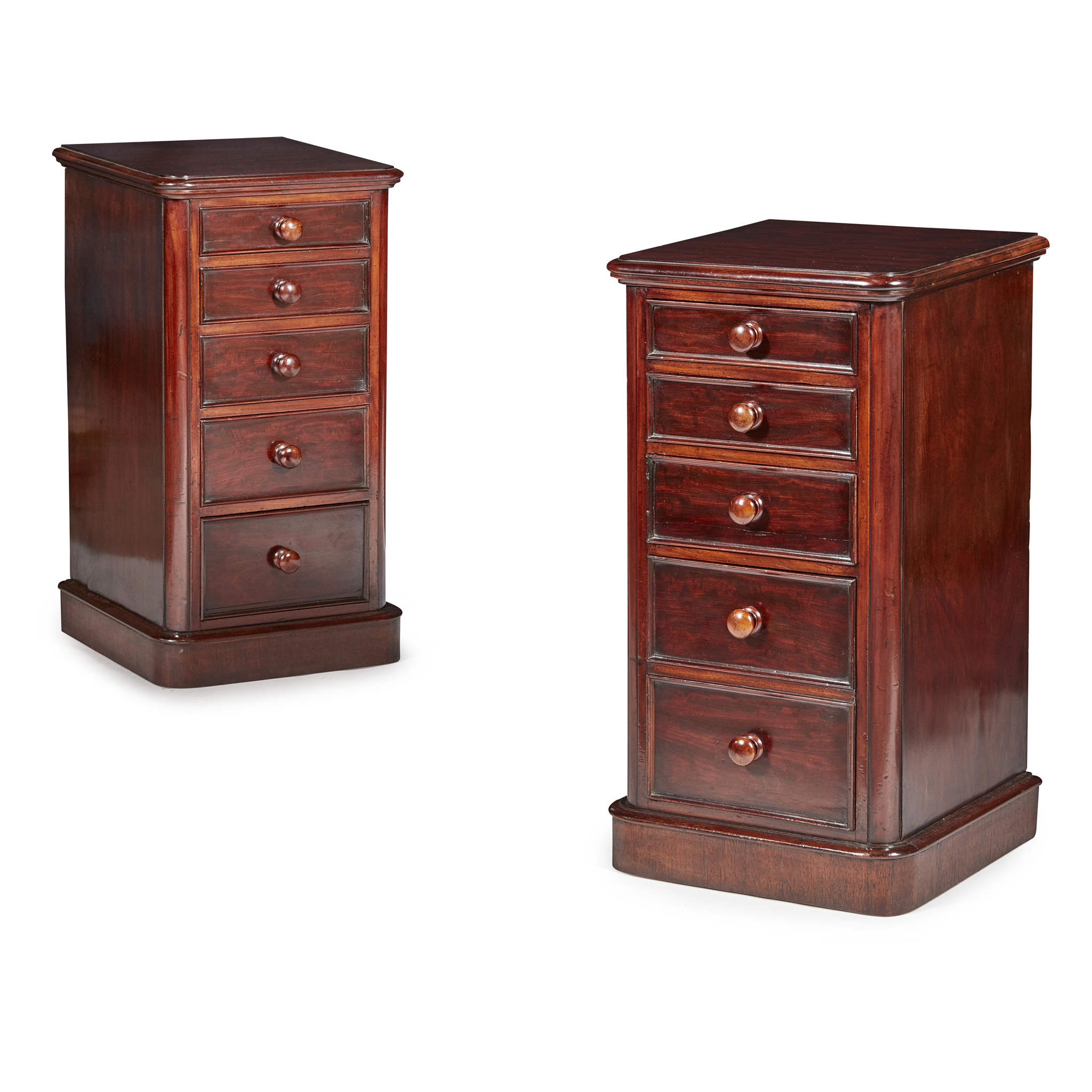 of neat size, the tops with moulded edges, one with five graduated drawers with moulded fronts and central knop handles, the other with four drawers, one with a double drawer front, on plinth bases (2)