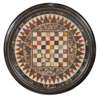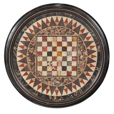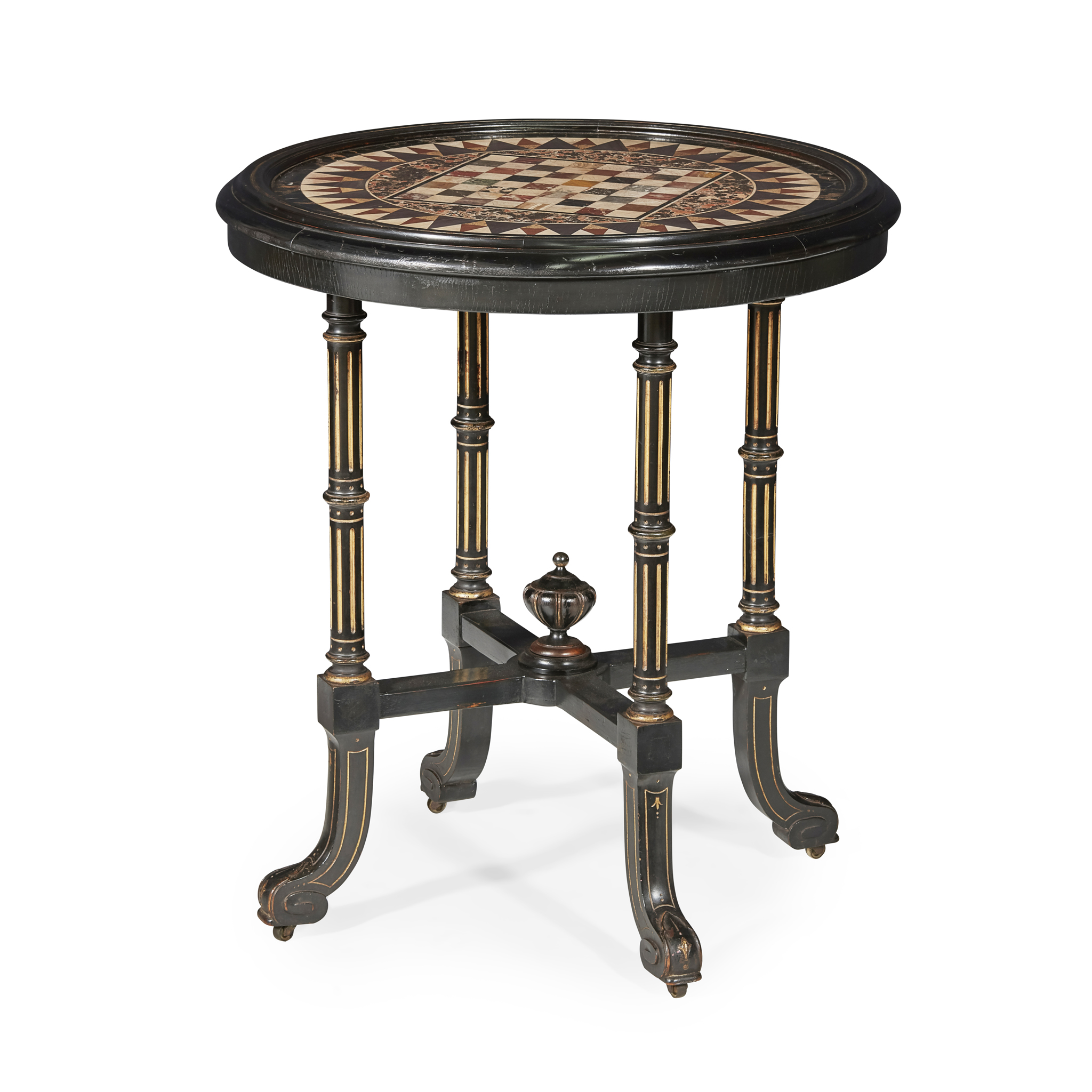 the circular top inlaid with various hardstones to form a games board, on four column supports joined by x-frame stretcher centred by an urn finial, raised on outswept legs with castors