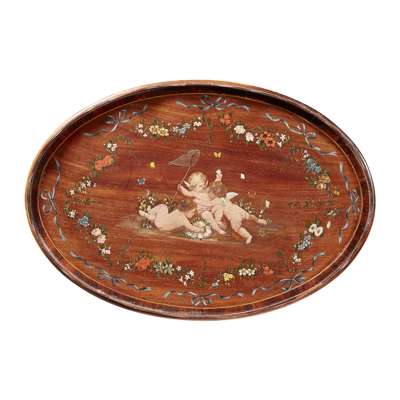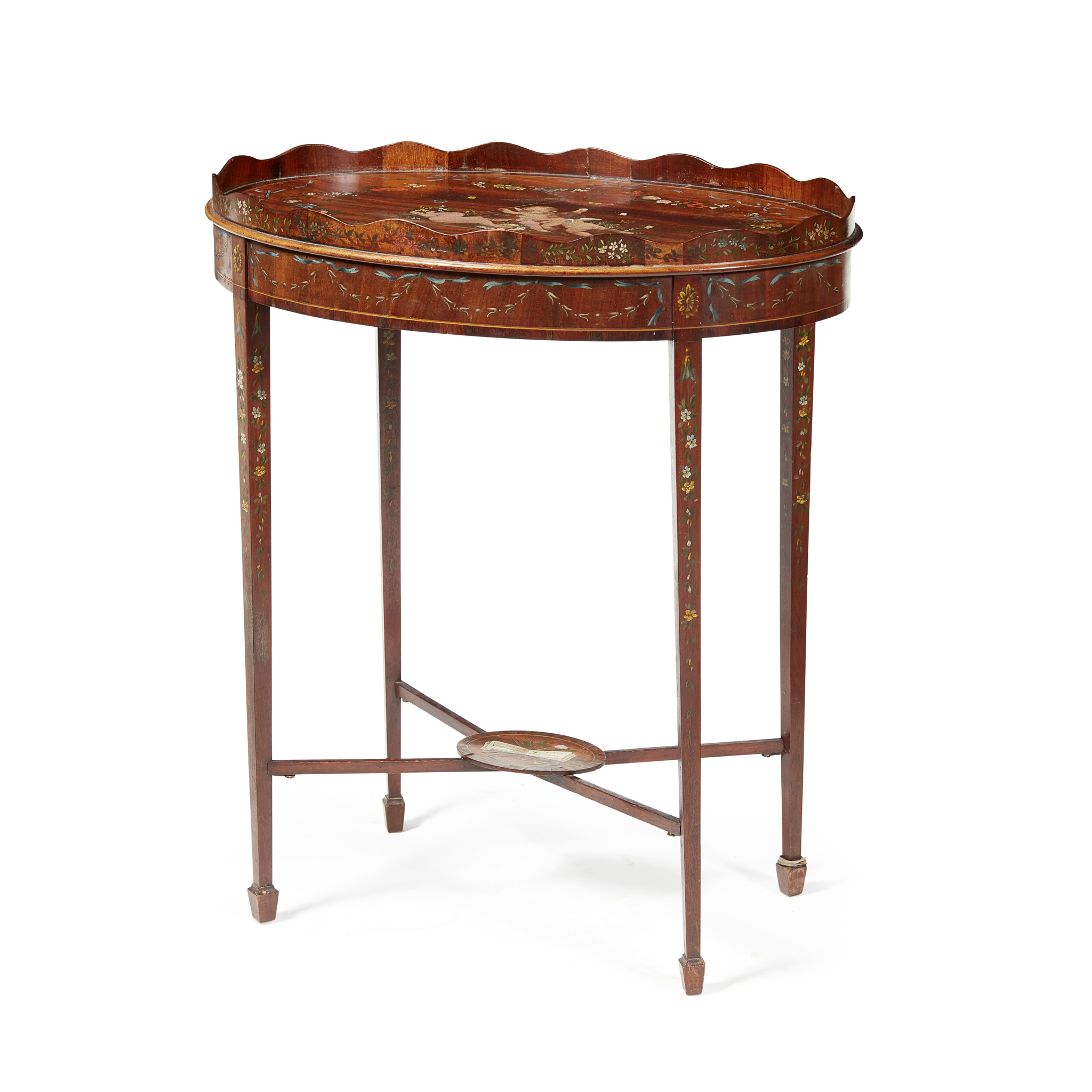 the oval top centrally painted with putti, within flower garlands and ribbons, with a wavy gallery, raised on square tapered legs joined by a X stretcher with a central oval platform and ending in spade feet